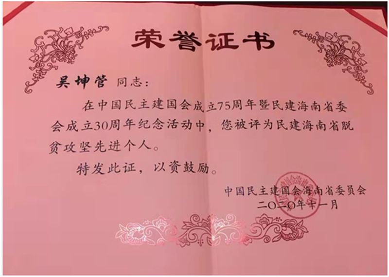 黨的十八大以來,在黨中央堅(jiān)強(qiáng)領(lǐng)導(dǎo)下,在全黨全國全社會(huì)共同努力下,我國脫貧攻堅(jiān)取得決定性成就,彰顯了中國共產(chǎn)黨領(lǐng)導(dǎo)和我國社會(huì)主義制度的政治優(yōu)勢。這些成績的取得,凝聚了全黨全國各族人民智慧和心血,民企也貢獻(xiàn)了自己的力量。 脫貧攻堅(jiān)是實(shí)施鄉(xiāng)村振興戰(zhàn)略的前提和基礎(chǔ)。只有如期實(shí)現(xiàn)現(xiàn)行標(biāo)準(zhǔn)下的農(nóng)村貧困人口全部脫貧,才能實(shí)現(xiàn)全面建成小康社會(huì)的目標(biāo),才能為實(shí)施鄉(xiāng)村振興戰(zhàn)略打下堅(jiān)實(shí)基礎(chǔ)。沒有農(nóng)村貧困地區(qū)如期脫貧,就沒有鄉(xiāng)村振興。脫貧攻堅(jiān)、擺脫貧困是鄉(xiāng)村振興的基礎(chǔ)和前提、是否能如期打贏脫貧攻堅(jiān)戰(zhàn),將深刻影響鄉(xiāng)村振興戰(zhàn)略實(shí)施的進(jìn)程。 海南壽南山集團(tuán)旗下的海南壽南山酒店管理有限公司總經(jīng)理吳坤管先生在中國民主建國會(huì)成立75周年暨民建海南省委會(huì)成立30周年紀(jì)念活動(dòng)中被評為 “脫貧攻堅(jiān)先進(jìn)個(gè)人”,這不僅是對吳坤管先生在脫貧攻堅(jiān)工作中的肯定,更是對我們海南壽南山集團(tuán)在履行社會(huì)責(zé)任與擔(dān)當(dāng)?shù)陌?jiǎng)。